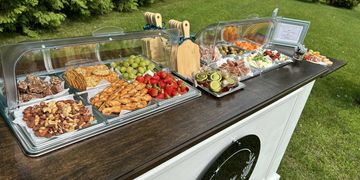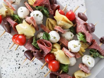 Our Elevated cart serves premium meats and cheeses with the standard accompaniments. An assortment of appetizer skewers is included, with tempting options like our signature antipasto skewers.
